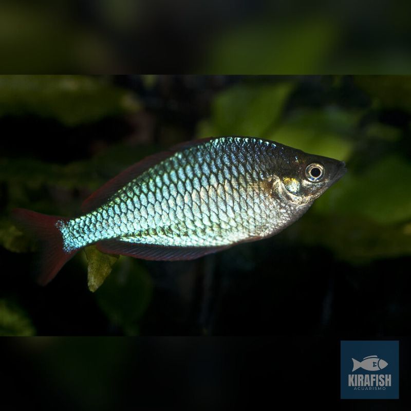 El Melanotaenia praecox, conocido como Arcoíris Enano, es uno de los peces más coloridos, activos y atractivos para acuarios plantados. Su cuerpo plateado con iridiscencias azules y sus aletas rojo intenso lo convierten en una especie ideal para quienes buscan un pez vistoso, pacífico y dinámico.